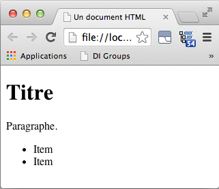 Les pages web sont des documents textuels décrits avec un langage à base de balises appelé HTML (HyperText Markup Language). Les différentes balises définies dans HTML permettent de structurer le contenu du document. Un exemple de document HTML très simple contenant un titre, un paragraphe et une liste de deux éléments est présenté ci-dessous.